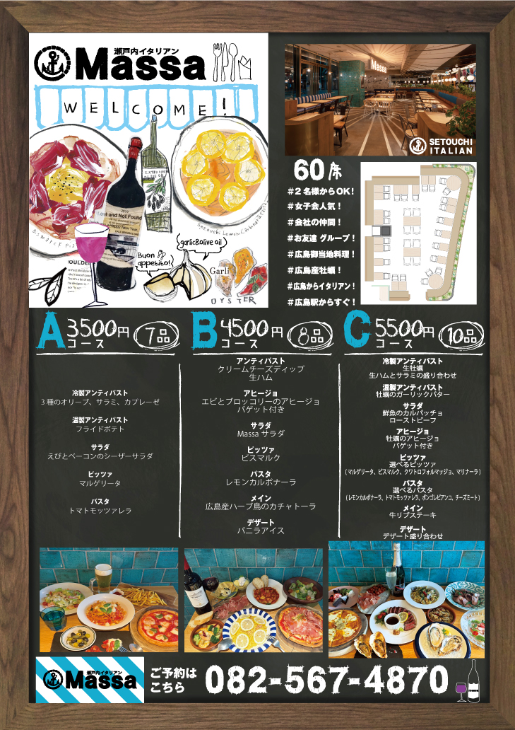 ■瀬戸内イタリアンMassa 広島駅ekieダイニング店 082-567-4870 Googleマップ 〒732-0822 広島県広島市南区松原町1−2 ekieダイニング 営業時間: 11:00~22:00